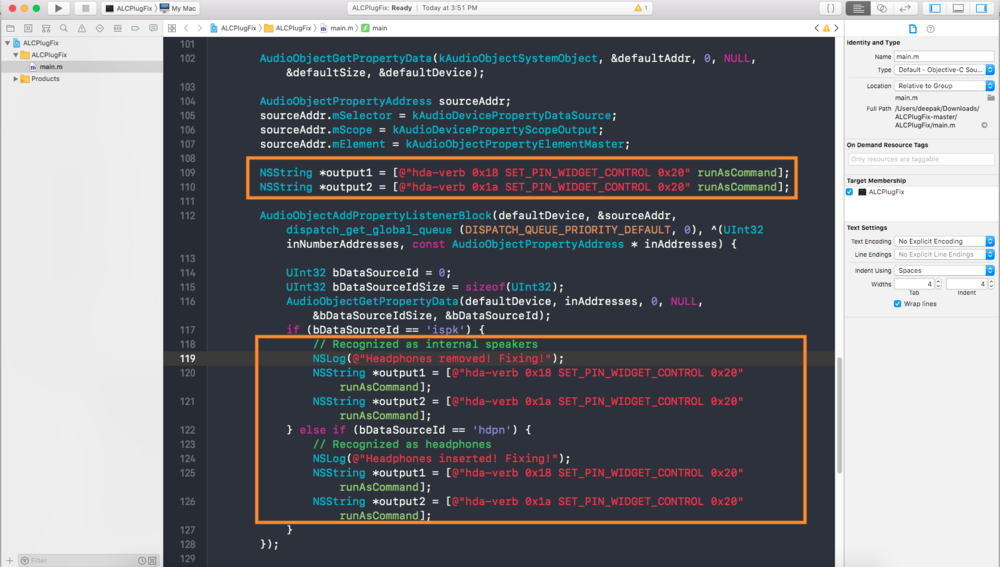 Hi Everyone All new laptops and OSX causing Distortion/Crackling Sound and these new laptop has combojack instead traditional seperate jacks , so fixing this requires more workaround similar as linux is doing to work natively in OSX , i remember in July 2016 Goodwin_C ask me to fix ALC298 (ALC3266) for Dell XPS 9550, after understanding how linux is doing i was able to fix this with help of hda-verb Rehabman Port of linux hda-verb , special thanks to him , so i created a custom SSDT298 to use with CodecCommander this fixed combojack and static noise from headphone , after few days we found CodecCommander is not good when Speaker changes to Headphone same when Mic changes to Line-In , then commands need to send manually bcoz CodecCommander can't understand changes on OS Level , then i took break from Hack scene in 2017 Goodwin_C found a workaround to fix this issue , so he made ALCPlugFix and implemented same command in this and it was best method to fix this issue so far and using same method till now i'm receiving lots of request to fix same issue from very long time for many codecs , so it's time to share this method so it could help you fix this easily according your codec Requirements: Download latest version of CodecCommander https://bitbucket.org/RehabMan/os-x-eapd-codec-commander/downloads/ Codec_Dump of your codec from linux use this method mention here ALCPlugFix https://github.com/goodwin/ALCPlugFix How to fix Static Noise/Distortion/Crackling issue : 1. Copy hda-verb to /usr/bin folder 2. Find Pin-ctls in you codec_dump , below is example Pin Complex Nodes for Headphone Node 0x18 [Pin Complex] wcaps 0x40048b: Stereo Amp-In Control: name="Headset Mic Boost Volume", index=0, device=0 ControlAmp: chs=3, dir=In, idx=0, ofs=0 Amp-In caps: ofs=0x00, nsteps=0x03, stepsize=0x27, mute=0 Amp-In vals: [0x00 0x00] Pincap 0x00003724: IN Detect Vref caps: HIZ 50 GRD 80 100 Pin Default 0x411111f0: [N/A] Speaker at Ext Rear Conn = 1/8, Color = Black DefAssociation = 0xf, Sequence = 0x0 Misc = NO_PRESENCE Pin-ctls: 0x20: IN VREF_80 Unsolicited: tag=00, enabled=0 Power states: D0 D1 D2 D3 EPSS Power: setting=D0, actual=D0 so Pin-ctls in headphone nodes is Pin-ctls: 0x20: IN VREF_80 3. now we have to send command to codec using hda-verb use below command in terminal for Headphone : hda-verb 0x18 SET_PIN_WIDGET_CONTROL 0x20 = (Headphones Pin-ctls: 0x20 from codecDump) Now you will notice this issue is fixed Note : usually you don't need to send command for headphone only but in few case you need to send command to Line-In, Mic or Speaker too , you can create Custom SSDT to use with CodecCommander is better approach How to fix ComboJack issue: to fix combojack you need to send additional commands to Line-In (External Microphone) nodes 1. First find out which is your Line-In (External Microphone Combojack Node) is connected to Headphone Jack , below example : codec_dump Node 0x19 [Pin Complex] wcaps 0x40048b: Stereo Amp-In Control: name="Headset Mic Boost Volume", index=0, device=0 ControlAmp: chs=3, dir=In, idx=0, ofs=0 Amp-In caps: ofs=0x00, nsteps=0x03, stepsize=0x27, mute=0 Amp-In vals: [0x00 0x00] Pincap 0x00003724: IN Detect Vref caps: HIZ 50 GRD 80 100 Pin Default 0x411111f0: [N/A] Speaker at Ext Rear Conn = 1/8, Color = Black DefAssociation = 0xf, Sequence = 0x0 Misc = NO_PRESENCE Pin-ctls: 0x24: IN VREF_80 Unsolicited: tag=00, enabled=0 Power states: D0 D1 D2 D3 EPSS Power: setting=D3, actual=D3 Node 0x1a [Pin Complex] wcaps 0x40058f: Stereo Amp-In Amp-Out Control: name="Headphone Mic Boost Volume", index=0, device=0 ControlAmp: chs=3, dir=In, idx=0, ofs=0 Amp-In caps: ofs=0x00, nsteps=0x03, stepsize=0x27, mute=0 Amp-In vals: [0x00 0x00] Amp-Out caps: ofs=0x00, nsteps=0x00, stepsize=0x00, mute=1 Amp-Out vals: [0x80 0x80] Pincap 0x0001373c: IN OUT HP EAPD Detect Vref caps: HIZ 50 GRD 80 100 EAPD 0x2: EAPD Pin Default 0x411111f0: [N/A] Speaker at Ext Rear Conn = 1/8, Color = Black DefAssociation = 0xf, Sequence = 0x0 Misc = NO_PRESENCE Pin-ctls: 0x20: IN VREF_HIZ Unsolicited: tag=00, enabled=0 Power states: D0 D1 D2 D3 EPSS Power: setting=D0, actual=D0 Connection: 2 0x0c* 0x0d there is two node 19 and node 1a , we have to use node 1a this is combojack node one jack for Headphone/Mic Node 0x19 "Headset Mic Boost Volume" Node 0x1a "Headphone Mic Boost Volume" "Headset Mic Boost Volume" = External Port (Sperate Mic Jack) "Headphone Mic Boost Volume" = ComboJack (One Jack for Headphone/Mic) 2. Find Pin-ctls in your codec_dump , below is example Pin Complex Nodes for Line-In Node 0x1a [Pin Complex] wcaps 0x40058f: Stereo Amp-In Amp-Out Control: name="Headphone Mic Boost Volume", index=0, device=0 ControlAmp: chs=3, dir=In, idx=0, ofs=0 Amp-In caps: ofs=0x00, nsteps=0x03, stepsize=0x27, mute=0 Amp-In vals: [0x00 0x00] Amp-Out caps: ofs=0x00, nsteps=0x00, stepsize=0x00, mute=1 Amp-Out vals: [0x80 0x80] Pincap 0x0001373c: IN OUT HP EAPD Detect Vref caps: HIZ 50 GRD 80 100 EAPD 0x2: EAPD Pin Default 0x411111f0: [N/A] Speaker at Ext Rear Conn = 1/8, Color = Black DefAssociation = 0xf, Sequence = 0x0 Misc = NO_PRESENCE Pin-ctls: 0x20: IN VREF_HIZ Unsolicited: tag=00, enabled=0 Power states: D0 D1 D2 D3 EPSS Power: setting=D0, actual=D0 Connection: 2 0x0c* 0x0d so Pin-ctls in line-in nodes is Pin-ctls: 0x20: IN VREF_HIZ 3. now we have to send command to codec using hda-verb use below command in terminal for Line-In (External Microphone) : hda-verb 0x1a SET_PIN_WIDGET_CONTROL 0x20 before send command you need to plug headphone in combojack , this will fix your issue but when you unplug and replug headphone again you need to send command everytime so to fix this use ALCPlufix 4. Open ALCPlufix project in Xcode , you need Xcode to build and modify source now change your node and Pin-ctls as in above image in 3 sections hda-verb 0x18 SET_PIN_WIDGET_CONTROL 0x20 (Node18 Headphone) hda-verb 0x1a SET_PIN_WIDGET_CONTROL 0x20 (Node1a Line-In) 5. Build project and copy ALCPlugFix to alc_fix folder and then run in