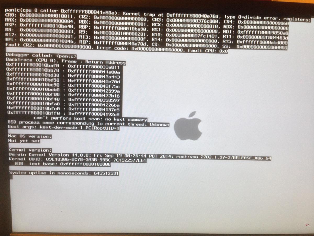 6. I'm starting te become desperate ... I've been trying al sort of things and nothing I've done so far works. Have now gotten so far as to get the install screen (using unifail, with multifail waiting to help) but as soon as I give <ENTER>, everything goes wrong! Inside are: 24 GB DDR3 Ram 2 Xeon 5570 CPU's either a Saphire HD5770 or a Quadro 2000 graphics card 1 HD [500GB SATA] precooked as a Guid partition disc (MacOS journaled) no other peripherals attached ( no WiFi-stick, no internal USB peripherals, nothing) 1 USB Apple keyboard, with an Apple mouse 1 DVD drive 1 24" screen attached through DVI. I've attached some pics of the error messages on screen after install-trial. Hope you can point me in the right direction ! Kind regards, Arthur Flederus
