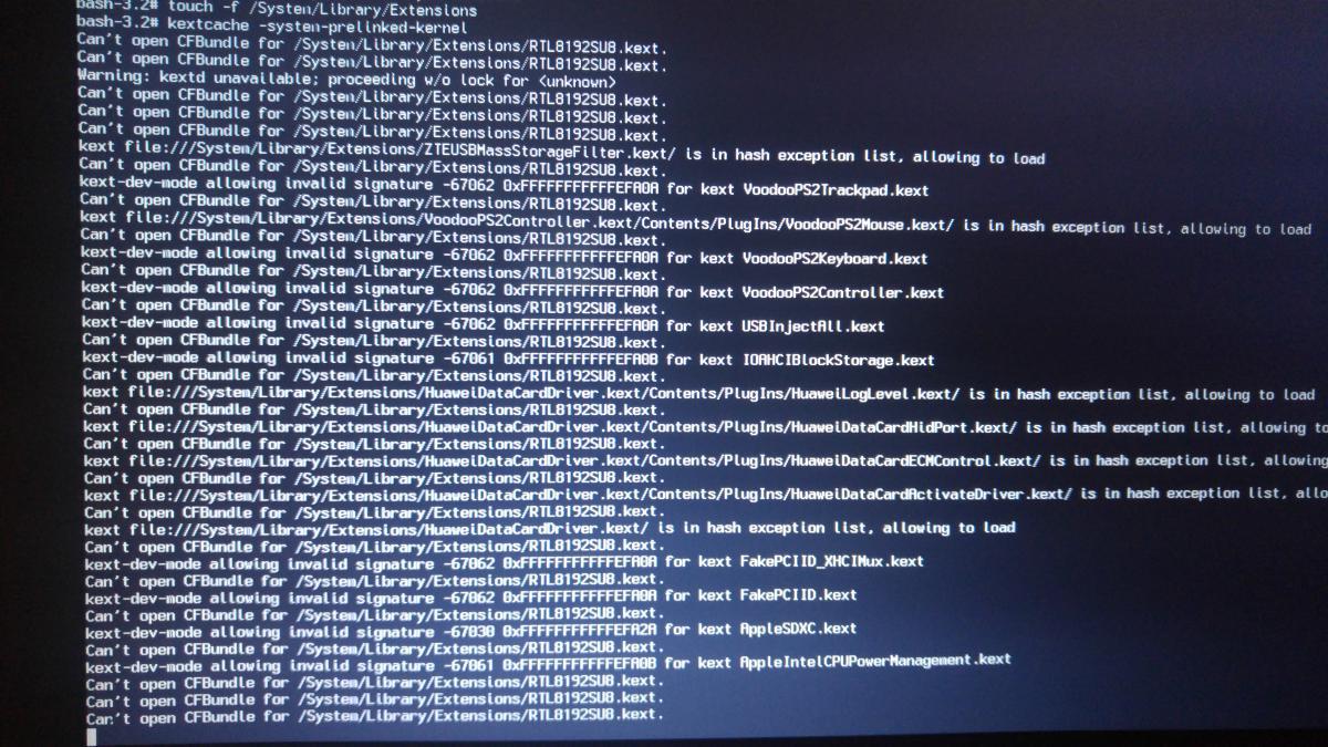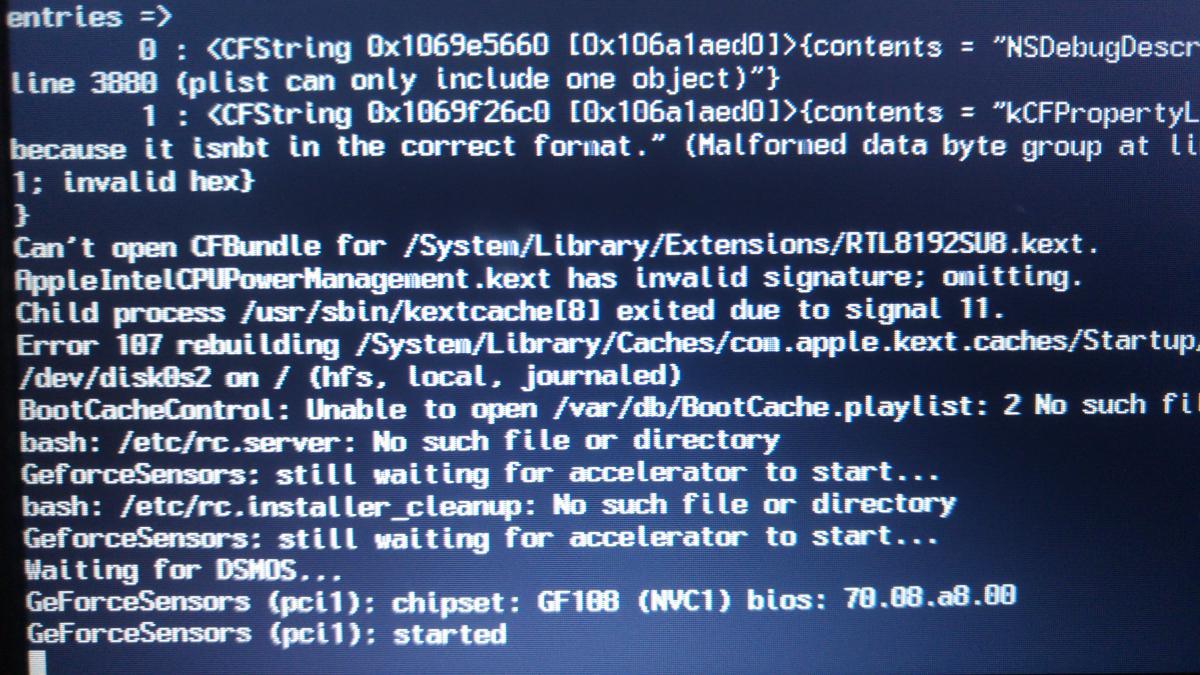 @ BronXTeck I did a repair permissions & rebuild kernel cache from single user mode (I have no USB boot drive ) with no success. I got errors as before. As you'll see in my screenshot I got errors "invalid signature" on many kexts along with "can't open cf bundle for S/L/E/*kext" Then I tried the repair and rebuild CMD again but with the last line of the CMD to -f -update volume / and got some different errors as you can see from screenshots. Alot of "*.kext/ is in hash exception list" along with many invalid signature's for kexts, finishing with "bash/etc/RC.server no such file or directory" And I always have an error "boot cache size is larger than physical memory" Apologies for bad format of my post I'm uploading and writing this from my phone.