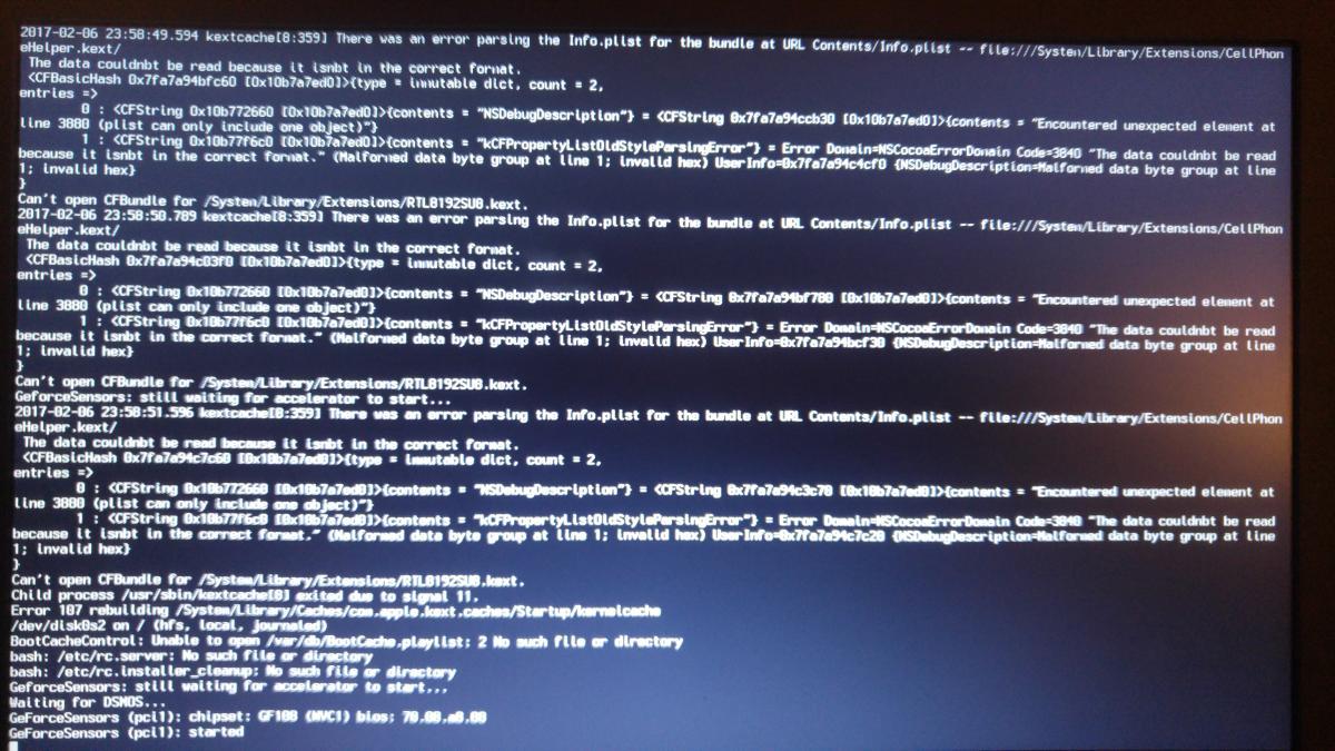 My e6430 has been running nice with Yosemite for sometime now, thanks to the help of this forum and Jake lo in particular. Then I decided to try patch the the cellphonehelp.kext in S/l/E from a guide here to get WWAN working, I did as followed in the guide spending alot of time on every step as I know it only takes one error to cause problems, and the last thing I wanted was to mess up my nice running Yosemite which has everything working on it from an expresscard 34 PCMCIA & a usb 3 hub with full speed. Finally after doing the patch to Cellphonehelper.kext i ran a repair permissions & rebuild cache with kext wizard,and on reboot i came into problems & cannot boot to desktop. I have tried various boot flags in the hope I could get to login and rectify what I did wrong such as repairing the system cache from terminal, but none of the flags will work. I've tried single user -s , safe mode -x, boot without kernel cache -F, system cache -f and combinations of these which I'm not even sure if I should do that. Ive searched here and other places for results on my errors listed in verbose mode but none seem to match my errors. They don't seem to be the usual "waiting for dmos" type of errors, very different from the errors when i was originally getting osx running & post install with main devices. I have searched high & low but can't find any related info on my errors. As you can see from my attached screenshots, the first line refers to an error parsing the contents of the info.plist of the cellphonehelper.kext, obviously my mistake in patching it. Then the errors refer to “cant open CFbundle for S/L/E RTL8192SUB.kext†and this is repeated until “error 107 rebuilding S/L/Caches/com.apple.kext.caches/startup/kernel. Then the last line being “GforceSensors (pcl1) : I know this is part of the challenge we all face in trying to get osx running with our devices, and I am determined as always to learn from these challenges as they come , but I am very limited in my knowledge of understanding computer code language so I would greatly appreciate your help in getting my system running right again.