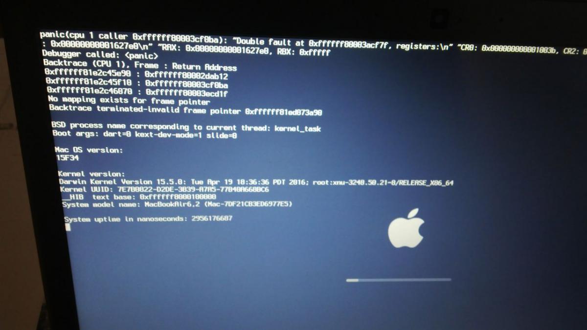 Good day all, I don't really know if I should post this here or not so if not, please move it to the correct one. I've successfully managed to get my Dell Latitude E7440 up and running with OS X 10.11.3 and 10.11.5 The problem i have for 2 weeks now is that after installing all applications i need, it suddenly stops booting. After some long frustration nights i then took my time to install every single application 1 by 1 with a reboot in between just to know which application causes the ongoing reboots with the error in this picture. Finally I found out that it's Xcode that's causing it. Can anyone help me with this error? I need Xcode to do some development as I'm in the learning of building apps with Xcode.