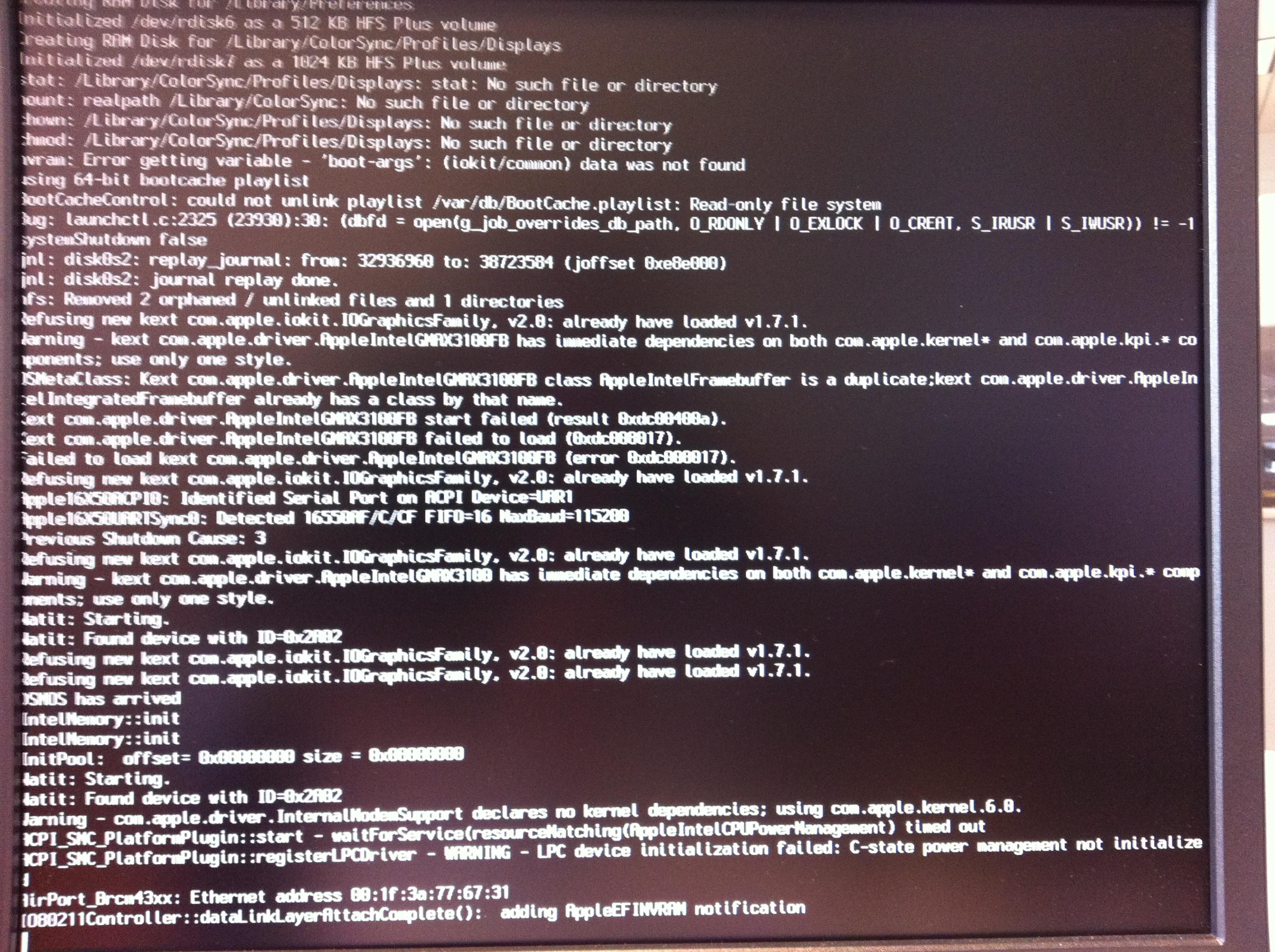 Hi, I have an issue with my D630 nVidia. I can no longer boot my installed disk, nor any USB installer key (10.8.4 & MyHack). System goes all the way to load drivers (-v boot option, long lines with the full path of the read files) and just when it should start the kernel (when the screen turns black), it just either freezes, or in 98% of the cases, it reboots. Last message on screen when frozen / before it reboots is"Allocate kernel memory error" "This is a non recoverable error! System HALTED!!!". I suspected my RAM to be bad, so I ran memtest for 12 hours +, going over 3 full passes with no error. I re-flashed the latest bios (A18), in case. I can run Dell diagnostics no error. I also suspected I was generating invalid USB install keys with MyHack, but the same key that does not work on this system does boot fine my D630 Intel up to the Installer Screen. Key's good. Tries MyHack versions 3.1.2 and 3.2 beta 8. Not better. I can boot a Linux Live CD (Mint 13 x64) and use the system, I don't see issues with it. Please let me know if you have any idea about what to test & investigate. Gl. -