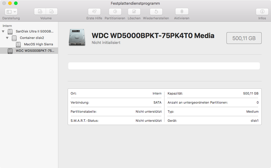 Hello, I have a Latitude E6430 with High Sierra. In my old installation on a Latitude E6420 with El Capitan, I had a 500GB HDD for music and data in my media bay. I tried to install Sierra and High Sierra on this old machine, but facing problems with the built-in HD3000 leads me to buy a newer E6430. During the upgrade steps, I found out, that the HDD in the MediaBay was not recognized by Sierra and High Sierra on both machines. Can anyone give me an advice, to bring the extra storage online again? All I see in the diskutility is an un-initialized disk, which should be initialized, but during unmounting, even in terminal manually, it stops and nothing happened. When I connect the disk to my other hack (Workstation with Sierra) the disk appears with its data. I already reformatted the disk, but without effect. It seems to me, that there is some kext missing, accessing the Mediabay SATA port. When I insert the OS installation disk, the boot-up in verbose mode do not find the disk.