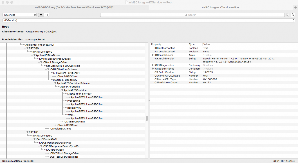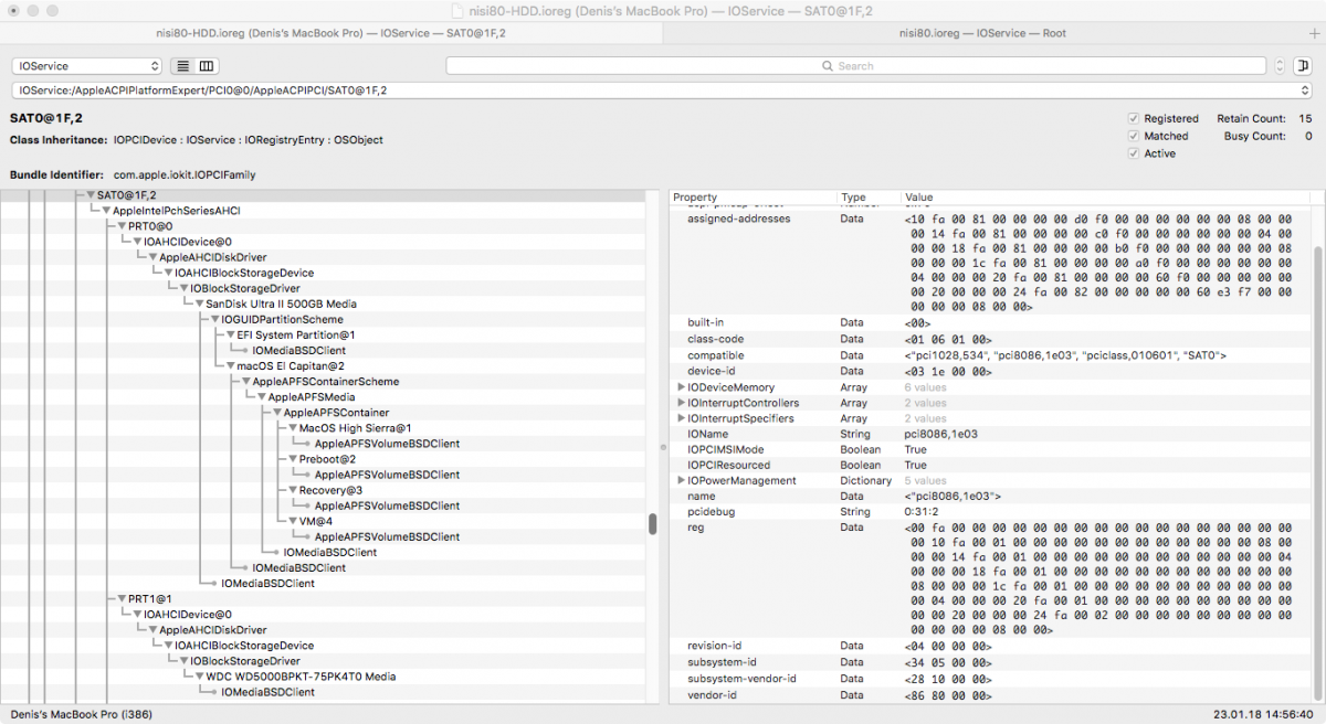 Hello, here is, what I can see in IOReg-Explorer. The first picture show, when a DVD drive is inserted and the second one, when the HDD is inserted. I think, there is a strange difference to the OS SSD on port 0. What do you think?