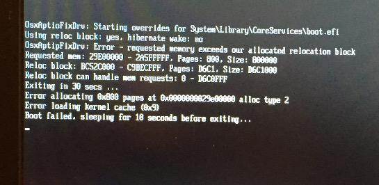 Did recommend replacements. Then changed 0x67 to 0x3 in config.plist. Upon reboot there's still no option in the menu to boot with NoCaches. I entered NoCaches=true on the Boot Args: line. Here's the failed boot image: I wish I could make this work; I don't like not being able to turn sip at all. Not giving up yet. Is there some other tell tail clue in the image? -