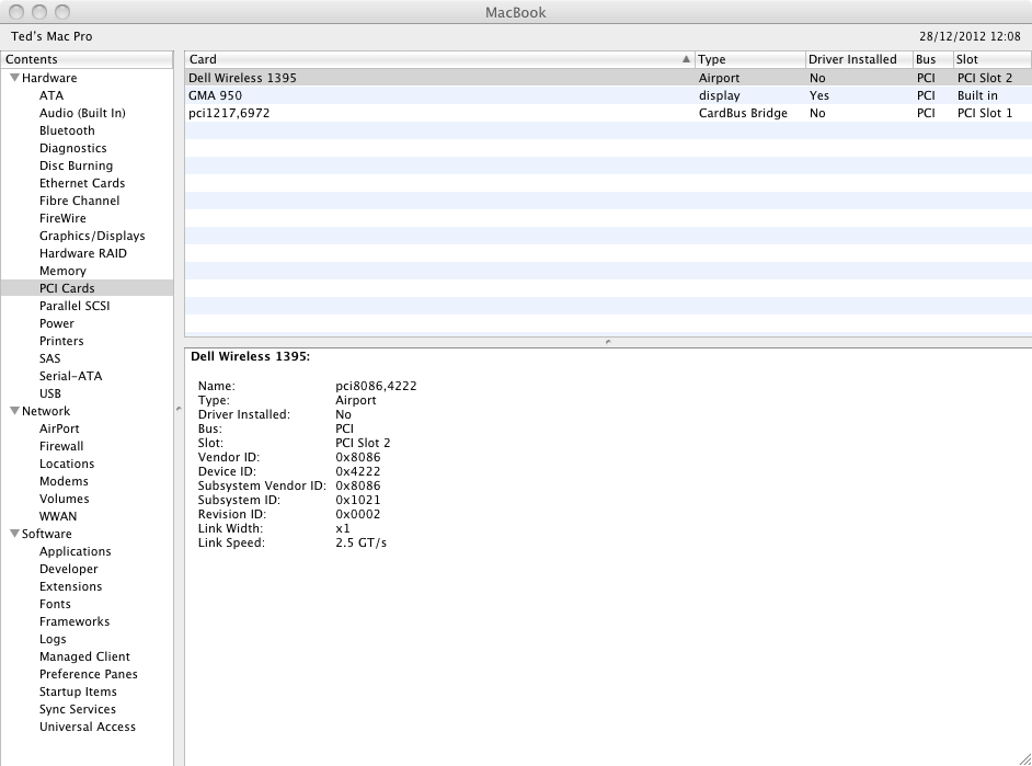 Happy holidays everyone. I just wanted to start with saying what a great website and thanks to your guides I have manged to make a fantastic D620 OSX SL Hackintosh with dual boot into Win 7. Even for a noob like me it turned out to be pretty straight forward using this site. It works like a dream except for an annoying lack of wifi. I've done alot of googling and tried a few kexts that didn't work. I've looked in system profile and OSX can see a Dell DW1395 in pci slot 2 and it even says Airport but there's no driver install...grrr! I've gone back to the latest EDP from here to get back to close as possible to a fresh install and start again The details for the DW1395 card are as follows: Name: pci8086,4222 Type: Airport Vendor ID: 0x8086 Device ID: 0x4222 Subsystem ID: 0x1021 Can anyone with much more knowledge and experience than me please help me find the answer to this final riddle on my hackintosh? Many thanks in advance