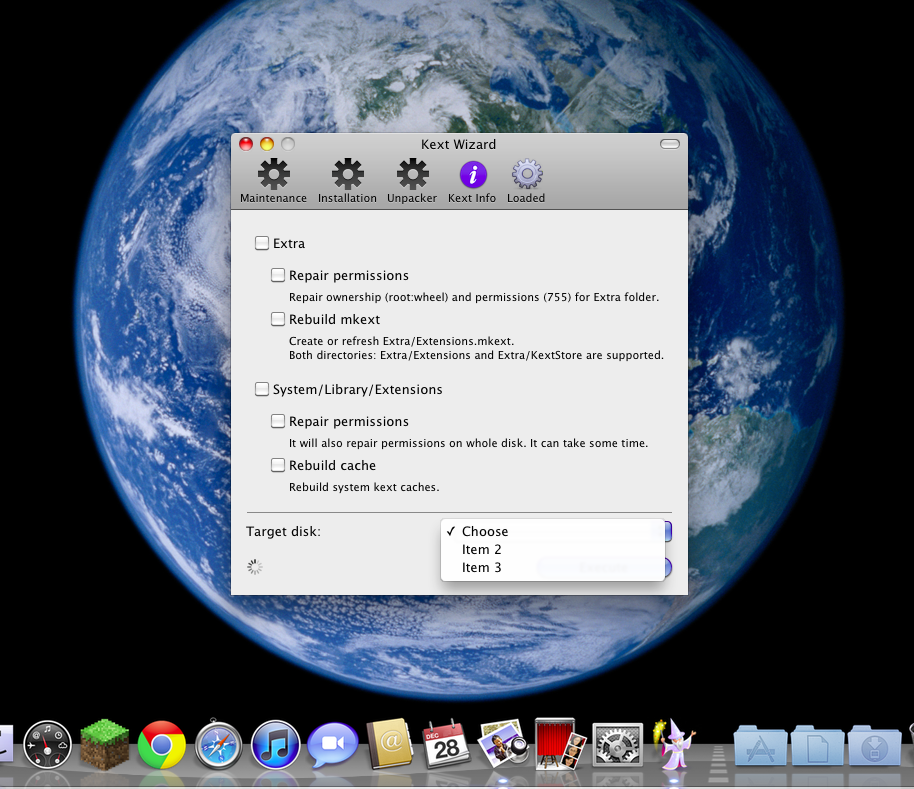 Ok I've tried the above with not much joy. I get some warning from the OS if cut and pasting from the desktop and even with using admin password it doesn't seem to paste in either recommended folders. So I thought Kext Wizard would help but seems to have a problem with finding the target drive/volume. It only gives item2 or item 3 as target volumes and doesn't seem to work. I can see the volumes on the desktop, if set in Finder prefs so not sure what going on with Text Wizard? The system boots like normal if left alone but if I use the -f line on the boot selection screen to try and reset permissions I get a restart request from the OS? But I'm guessing it's a case of too little a knowledge being dangerous when using boot commands or maybe a really messed up OSX in stall. Does OSX have a Safe Mode? Any help would be gratefully received please.