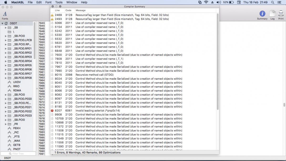 Having followed the pairing of section delimiters "{ & }" it looks to me as if I may have one to many } closing at the end of the method which shouldn't be there, as it is defining an end to section which should end further down? DTGP (Arg0, Arg1, Arg2, Arg3, RefOf (Local0)) Return (Local0) } } <- As in With this error 6126 is gone but replaced by: 4065, 6062, Initializer list longer than declared package length 4098, 6084, Object does not exist (DTGP) -