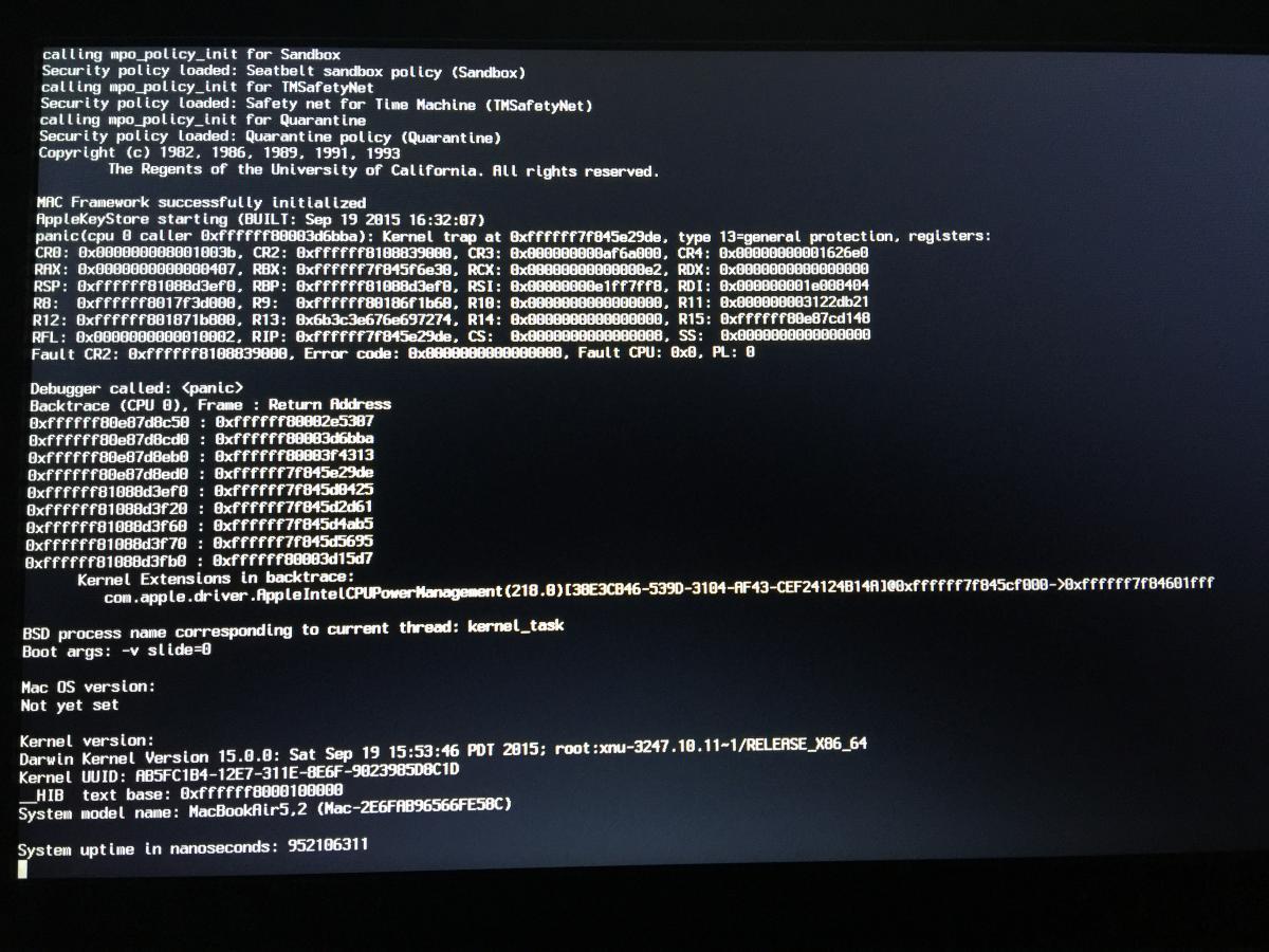 Jake, Thank you, Have downgraded to A02 (A03 not available) and upto to A11 - Still same issue; reloaded default BIOS settings and set to UEFI, AHCI etc and have also rebuilt the USB El Capitan installer... Verbose dump screenshot attached. Much appreciated. cheers -Steve -