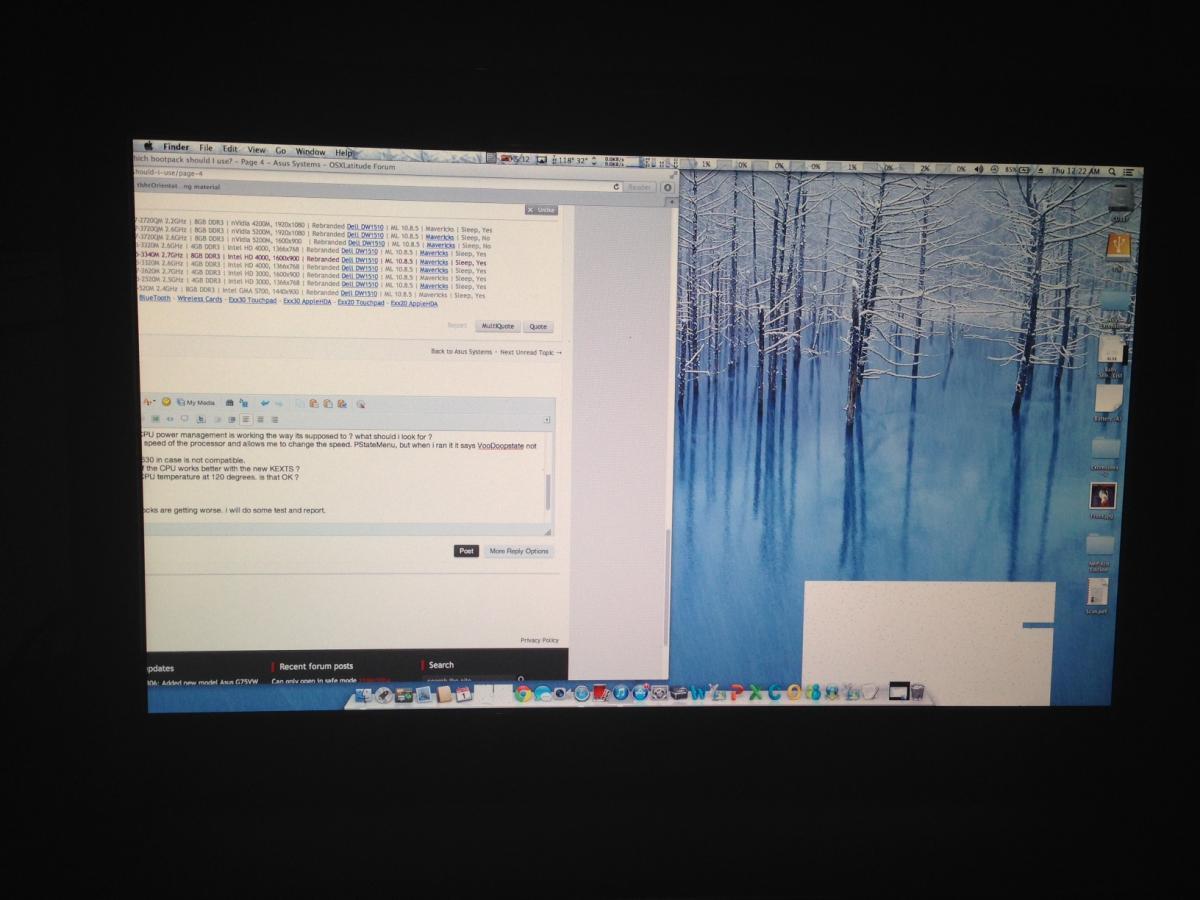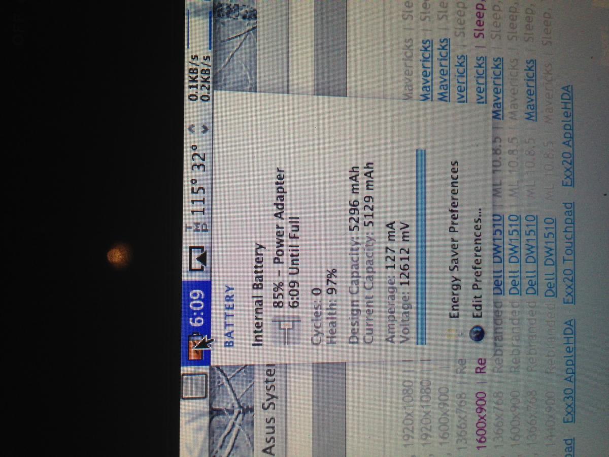 well thank you for your patience. it turns out i was not doing right. so, i rename the SSDT file, dropped in \EXTRA then drop the kext on \EXTRA\EXTENSION ran MYFIX, and rebooted. no panic, but no battery. then tried the second battery manager file, and that one worked. Battery works !! question. i am getting something weird .. little blocks of garbage on the screen. not too bad maybe two or three. hoping they go away. does it mean anything ? and second, how do i know if the new CPU power management is working the way its supposed to ? what should i look for ? on my D630 i have a menu that tells me speed of the processor and allows me to change the speed. PStateMenu, but when i ran it it says VooDoopstate not loaded. i didn't want to add that kext from my D630 in case is not compatible. basically all I'm asking is how can i tell if the CPU works better with the new KEXTS ? i have iStat menu loaded and it shows CPU temperature at 120 degrees. is that OK ? ======= EDIT: something is wrong. the garbage blocks are getting worse. i will do some test and report. also when battery percentage was at 75 % it said only 35 mins until full. now its at 85% and it says 5 hours until full. battery percentage doesn't go past 85% after hours of charging. (note the garbage on the screen bottom right of the picture) thanks again.