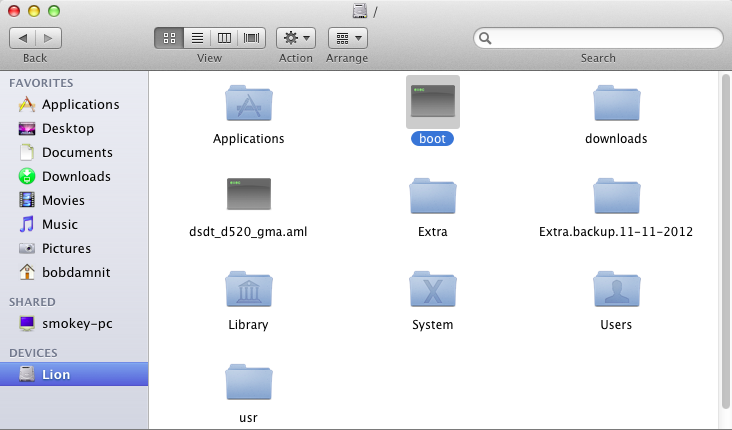 Open a Finder window. In the left window pane, at the bottom (Under "Devices"), you will see your hard drive. Click it. In the right window pane, you will see "boot". It looks like a shell script command. Replace that file with the one you get from the Chameleon package. Your finder window will look like this, when you do this properly: Notice the "boot" file is selected? (This is the one you want to replace with the one from the Chameleon package.) -