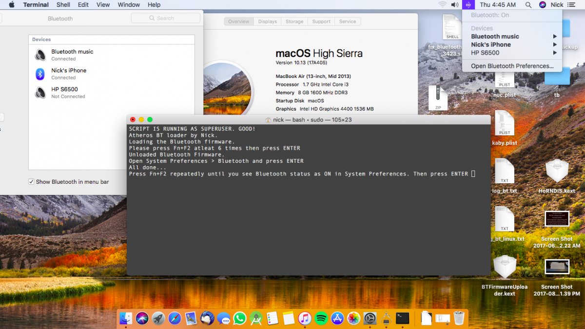@EMlyDinEsH Is there any support for ATHEROS AR9565 Bluetooth? I Have Wi-Fi working with patched IO80211Family.kext Below are my COMBO CARD specs:- - Vendor Id (168C) - Device Id (0036) Love from India
