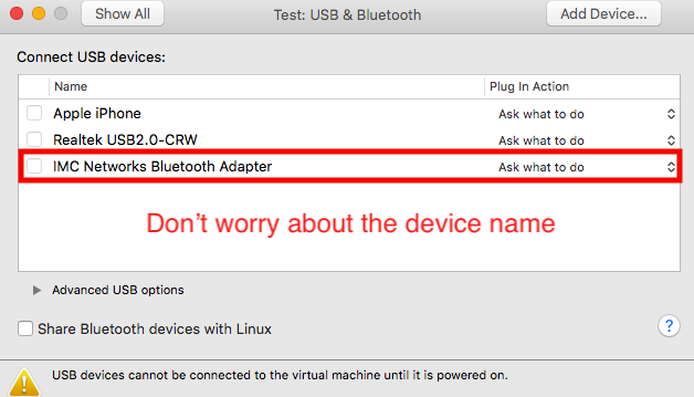 Hello awesome people, I have taken a lot from this community, this is the time to give something back. As we all know that BTFirmwareUploader.kext stopped working for some reasons after spending countless hours on this issue I finally came to a workaround. Not that this workaround is temporary, our awesome developer of the kext will find a fix for this for sure. UPDATE (2017-11-22) (Recommended) :- Hey guys, as you all might have noticed, all the workarounds mentioned below are not working properly since the macOS 10.13.1 incremental update. So, this got me investigating this issue further and I'm happy to say that I have finally come out with a proper fix. This process is a bit complicated but read on, once you set things up, working Bluetooth is just 3-4 clicks away. While I was busy investigating this issue, I came to the conclusion that Apple has changed a lot of stuffs in IOUSBHostDevice in macOS High Sierra. The developer of the BTFirmwareUploader is working on it (results are delayed due to his personal life problems). Let's first understand how Bluetooth firmware uploader works in *NIX based systems. A few bluetooth devices have the firmware required for bluetooth embedded in them and hence they are not problematic, but a lot of devices rely on firmware uploader to function properly. You can have a look at ath3k.c file in Linux kernel tree to get the idea of how the firmware is uploaded to the device. Cutting the nerd stuff out, here is the process in short, the system powers up the bluetooth device, the firmware uploader detects that the device is powered on and then it sends(uploads) the firmware in buffers. If you look in Apple Menu > About this Mac > System Information > Bluetooth you can see our device is recognized properly (look at vendor and product ids) but is not pairing to any other peripheral because of the missing firmware. So, in order to fix bluetooth,we have to upload the firmware to the bluetooth device, there is more than one way to do it. The simplest would be using a FirmwareUploader kernel extension (which doesn't seem to be working in our case) The second option is, Booting into Linux/Windows and then cold warm booting (cold warm booting means booting macOS without powering down the machine, like on linux, power menu > restart) to macOS. What this does is, when we boot Linux/Windows the appropriate firmware is uploaded to the device and due to the way BT devices work, they don't lose the firmware until the device is not powered off. So, this would get the BT device working in macOS as the only thing missing was proper Firmware and now we have it loaded in our bluetooth device by booting other OS. This would work fine on macOS 10.13, but sadly, in macOS 10.13.1 when we boot the operating system (hot boot/cold boot) it resets the Bluetooth device. Hence, we lose our uploaded firmware. The method we are going to use is based on the above method except we won't be losing our firmware until we restart or put our machine to sleep. This is how it works, we boot linux (you may try with windows) in a virtual machine and share our bluetooth device (exclusively to guest OS, i.e. Disconnecting the device from macOS and connecting it only to Virtual Machine). What this will do is, as soon as we connect our device to Linux VM the Linux kernel will upload the required firmware in our BT device. Then, we will disconnect the device from VM and connect it to macOS (Hot plugging works fine, thanks to USB). Technically, we uploaded the firmware, switched the connection from VM to Host OS(macOS) without powering off the device. So, we still have the firmware, this is what we wanted, right? Okay, enough talking, let's do it. Prerequisites :- Linux bootable ISO (You can download one here) A VM software (I used VMware Fusion, you may try with VirtualBox). On a second note, VirtualBox should not be the preferred VM Software on a hack as it tends to cause issues with proper functioning of USB controller in macOS) Patience and little bit of your gray matter. Remove any existing Firmware Uploader and then reboot by rebuilding caches. How to do it :- I am going to explain the entire process by assuming that you are using VMware Fusion. First up, open VMware Fusion and press Cmd + N or File > New to create a new virtual machine. Select Custom Virtual machine. In the next screen select Linux > Ubuntu 64-Bit Click on Next and then Finish the setup by saving the virtual machine to your desired location. You will see that upon finishing the process VMware will boot the virtual machine, but we don't want to boot it just yet (have to change a few configuration settings). So, select Virtual Machine > Shut Down from the Menu Bar (Confirm the prompt that you want to shut down) Now let's get to changing settings. Click the settings gear icon in your virtual machine window, it looks like, Upon clicking it you will get a new window. Select the CD/DVD (SATA) pref in it. Now, check the box saying "Connect CD/DVD Drive" Now, if you look below you will see an option like, Click on the popup menu and select "Choose a disc or disc image" and then select your Linux bootable ISO file. So, upon changing the above settings that section should look like, Now click on "Show All" at the top to go back to the main pref pane. Now we need to change settings of Bluetooth devices. Select "USB & Bluetooth" pref in the main window. Upon clicking it you will see a screen like this, Now that you have unchecked the "Share BT Devices with Linux" you will see a new device popup in the above list, like, Now, click on "Show All" on the top again to go back to the main pref pane. Now we just need to change boot order to boot our live ISO image. Click on "Startup Disk" and then in the next pref pane, select CD/DVD and click Restart, like, Upon clicking restart, you will see that the VM boots up and you get GRUB menu like, Select "Try without installing". Yes, we don't even have to install the OS for real. We are pretty much don