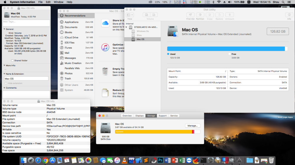 hi guy, my storage in high sierra when i has issue (+) increase the number of partitions on the device with Disk Utility now Mac OS info show 54.14 GB Capacity Exactly I use 126gb for Mac yesterday i increase the number of partitions on the device +1 partition(over 70gb) but has error shrinking too long How to fix it please help me I'm very poor english, please see in image to see the error