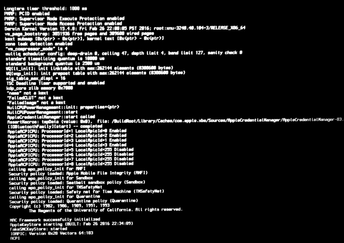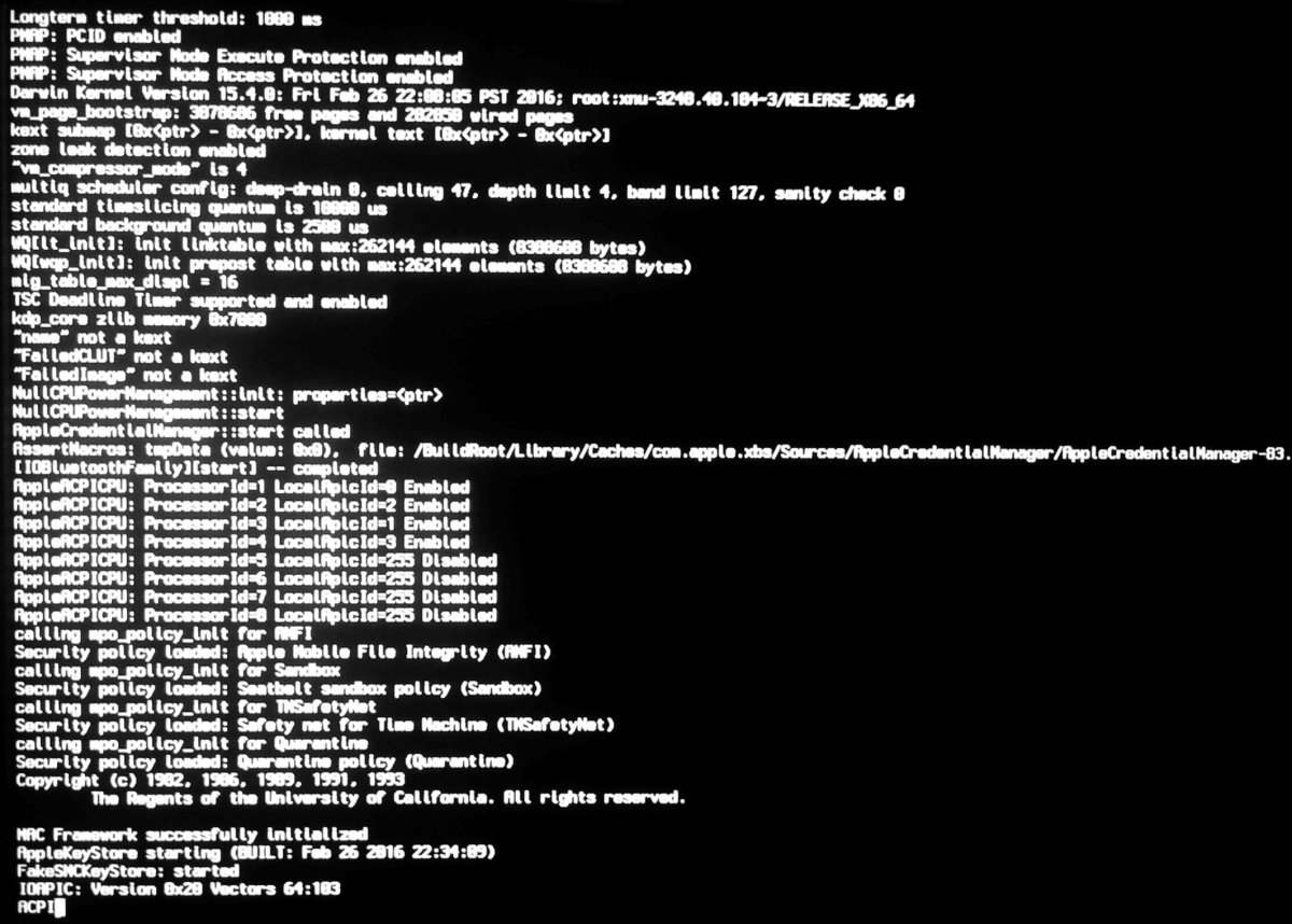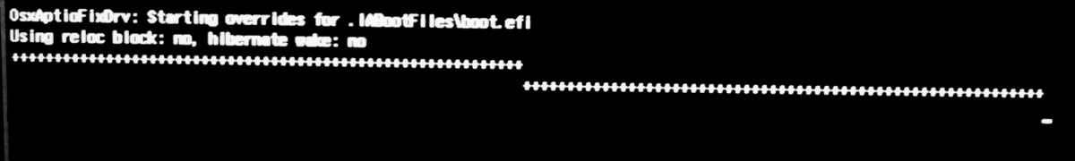 Hello, I successfully made OS X El Capitan 10.11.4 USB installer in VMware OS X (host OS win10), copying files to USB drive was quite long, but after about half an hour that was completed, then I put boot pack EFI folder in EFI partition. Then booted from prepared USB installer, Clover loaded successfully, then I chose normal OS X boot, with enter key, after 20 seconds on black screen appeared white apple and process stops on that, I waited about 5 minutes, there wasnt activity in USB drive (it has flash lights on read-write), then I pressed Esc and was returned to Clover UI. Then I booted OS X without cache and get such screen: Pressing Ecs returned to Clover UI. Logging was enabled, log file: Curious that with OSX made USB installer's EFI partition's root folder looks: But with Bootdisk Utility in Windows made USB installer's Clover partition's root folder looks: Probably it is OK, I dont know.