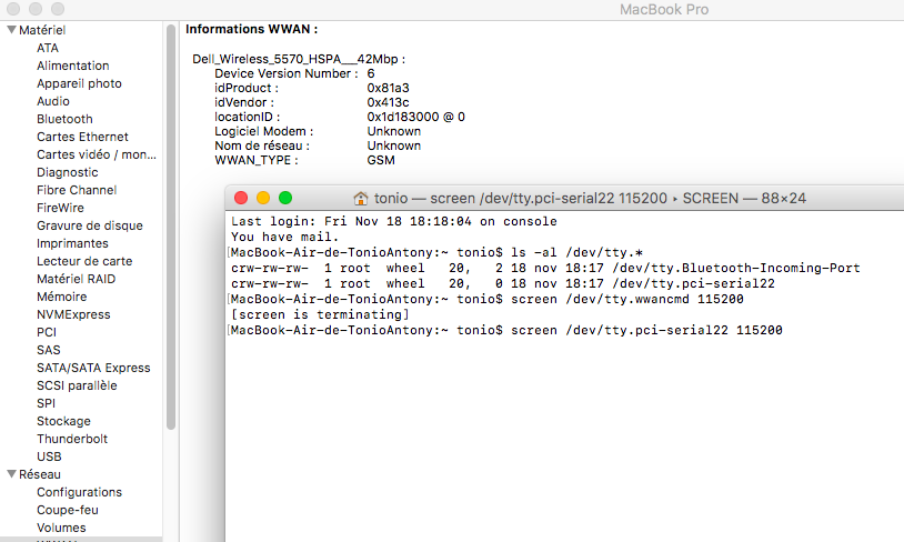 Thank you Hervé for this response and your analyse. Legacy_sierra_qmi.kext and CellPhoneHelper.kext are some command identified AT to communicate with the module For example : <key>ATCommands</key> <dict> <key>DirectoryNumber</key> <string>$nwmdn</string> <key>ESN</key> <string>+gsn</string> <key>Manufacturer</key> <string>+gmi</string> <key>Model</key> <string>+gmm</string> <key>ModemSW</key> <string>+gmr</string> It is not possible for me to have a response with a console and you see the same pb in the pictures : no response with logiciel model ..... Have you a solution to activate the ATcommands thank you for your reply best regards