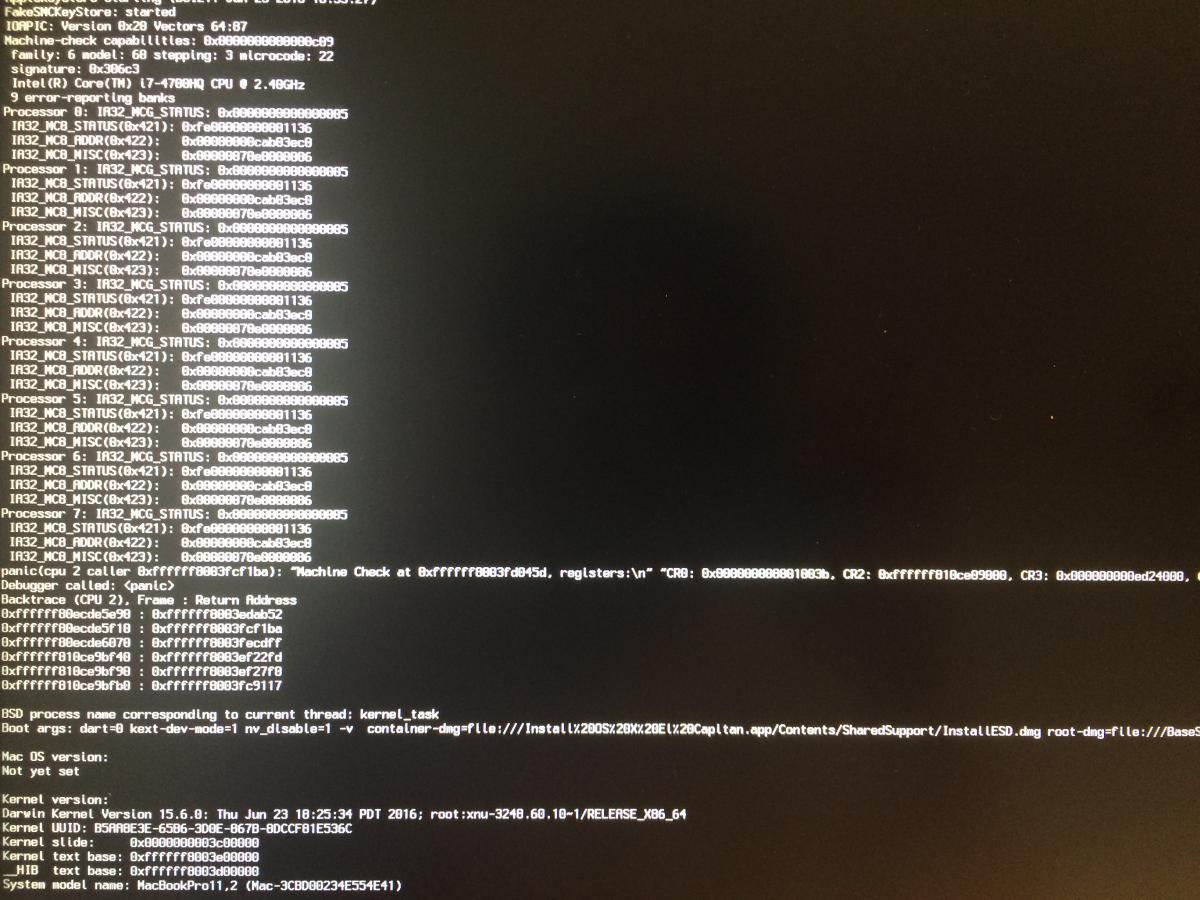 6. Hi, I'm new to hackintosh ! I was waiting for something made for my Asus N56JR and tadaaa OS X Latitude made it. I try to learn bymyself, running across forums but, and when I tried to boot the install process of El Capitan, my computer got stuck at what people call a Kernel Panic (I think). I tried my Asus into verbose mode, and this is what I get. (when everything stop loading, my computer keep working on something with the fan at maximum speed !). Can someone help me understand what I did wrong ? I place every file given at this page in the folder EFI as written in the "readme" file dowloaded with the .zip. Well, I think I did it right... Attached, a photo of the error displayed on the screen. I can upload a larger photo... with the all screen. Hope I'll get some help soon Thanks !