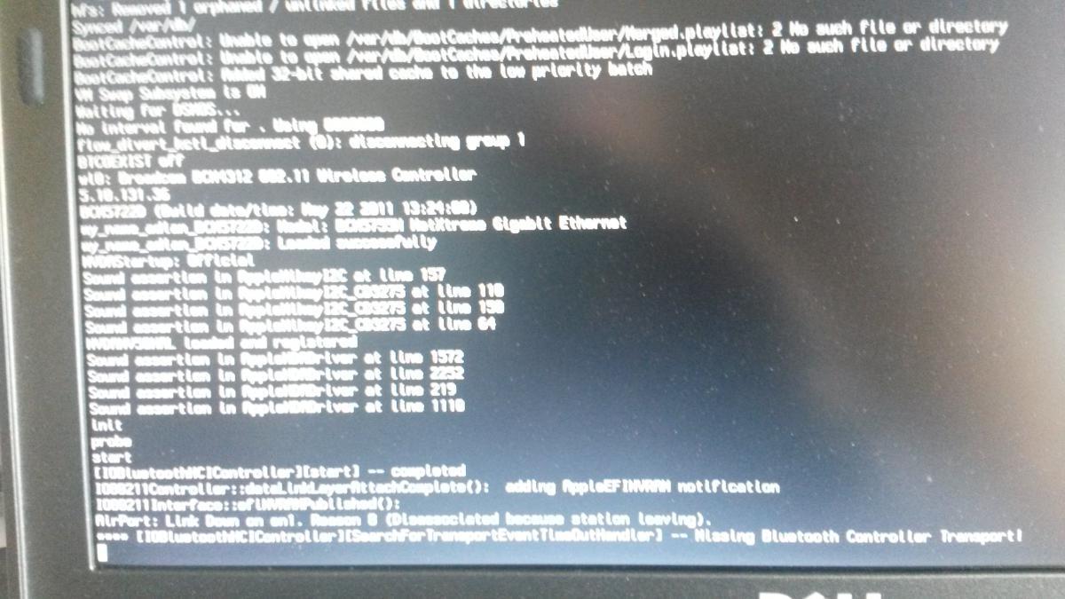 Hello there. I followed the guide to installing Mac OS X Lion on Dell Latitude D630 and right after loading everything from the Chameleon bootloader, I see a black screen with white writing on it showing a kernal panic: BCM5722D (setupDriver:920): MSI index on 1 panic(cpu 1 caller 0x2ccb0f): Kernal trap at 0x3624703a, type 14=page fault, registers: CR0: 0x8001003b, CR2: 0x00000000, CR3: 0x00100000, CR4: 0x00000660 EAX: 0x00000000, EBX: 0x0000085a, ECX: 0x00000000, EDX: 0x299cdffc CR2: 0x00000000, EBP: 0x2ff6bc58, ESI: 0x05eba800, EDI: 0x00000000 EFL: 0x00010246, EIP: 0x3624703a, CS: 0x00000008, DS: 0x00000010 Error code: 0x00000000 Debugger called: <panic> Backtrace (CPU 1), Frame : Return Address (4 potential args on stack) 0x2ff6ba98 : 0x22032e (0x6abf4c 0x2ff6bab8 0x229ef0 0x0) 0x2ff6bac8 : 0x2ccb0f (0x6b8488 0x3624703a 0xe 0x6b8431) 0x2ff6bb78 : 0x2e2e34 (0x2ff6bba0 0x2ff6bb88 0x2ff6bb98 0x5eba800) 0x2ff6bb98 : 0x3624703a (0xe 0xc0048 0x10 0x18000010) 0x2ff6bc58 : 0x3624861c (0x5eba800 0x0 0x4222 0x18000000) 0x2ff6bce8 : 0x36244e26 (0x5ee7a80 0x299cd000 0x1 0x0) 0x2ff6bd18 : 0x362eb798 (0x4222 0x5ee7a80 0x299cd000 0x1) 0x2ff6bda8 : 0x36296d22 (0x25232000 0x8086 0x4222 0x0) 0x2ff6be08 : 0x3623d828 (0x5dc2c00 0x8086 0x4222 0x0) 0x2ff6bea8 : 0x3623fd98 (0x5dc2c00 0x5dc2c00 0x0 0x5dc2c00) 0x2ff6bec8 : 0x647f1d (0x5dc2c00 0x5bb3e80 0x2ff6bef8 0x6064aa) 0x2ff6bf18 : 0x647c86 (0x5bb3e80 0x5dc2c00 0x5dc0480 0x2fb4d3b0) 0x2ff6bf68 : 0x648a7d (0x5bb3e80 0x5d52f80 0x0 0xffffffff 0x2ff6bf98 : 0x64a8a4 (0x5bb3e80 0x0 0x2ff6bfb8 0x1) 0x2ff6bfc8 : 0x2c5d0c (0x5d4fb90 0x0 0x2c5d1b 0x5ba5000) Kernel Extensions in backtrace: com.apple.driver.AirPortBrcm43224(500.36.11)[081ADA69-2E4E-4EB3-BDA3-1B5233BC5254 ]@0x36230000->0x363a7fff dependency: com.apple.iokit.IO80211Family(400.40)[41868296-83CF-41A4-813C-AB76C81DF1B7 ]@0x36182000 dependency: com.apple.iokit.IONetworkingFamily(2.0)[0D1D5E8F-C35E-4D3B-8A74-6D23BCDE48C6 ]@0x36086000 dependency: com.apple.iokit.IOPCIFamily(2.6.5)[371238D1-CD26-4E59-B860-D5CA04A2FA09 ]@0x2fb4b000 BSD process name corresponding to current thread: kernel_task Boot args: boot-uuid=47347ABD-AF7E-3EFA-9664-5C333F33BB48 rd=*uuid -v -v Mac OS version: Not yet set Kernel version: Darwin Kernel Version 11.0.0: Sat Jun 18 12:57:44 PDT 2011; root:xnu-1699.22.73~1/RELEASE_I386 Kernel UUID: F8596E5D-0966-3091-AA8D-6E11CA68386F System model name: MacBook3,1 System uptime in nanoseconds: 3266526966 Can you please help me? Thank you. P.S. I took a lot of time copying this. Just wanted to let you know .