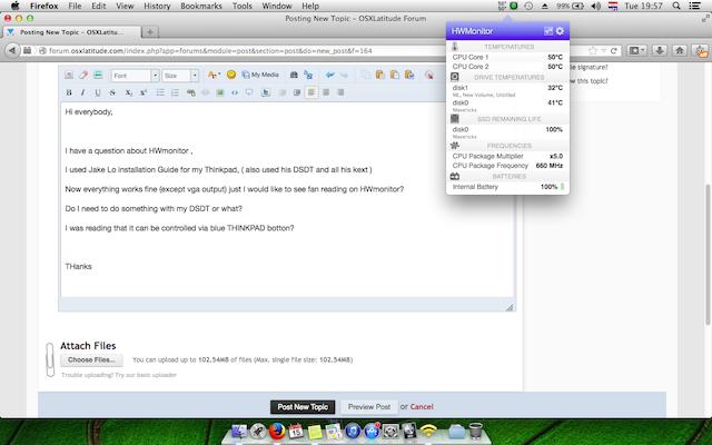 Hi everybody, I have a question about HWmonitor , I used Jake Lo installation Guide for my Thinkpad, ( also used his DSDT and all his kext ) Now everything works fine on 10.9.2 (except vga output), but the only thing I would like to see is fan reading on HWmonitor? Do I need to do something with my DSDT or what? I was reading that it can be controlled via blue THINKPAD botton? Here is the printscreen of my desktop and HWmonitor.. THanks