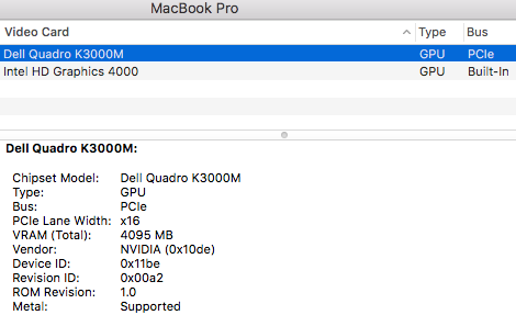 Hi folks, I would like to use my quadro graphics card for the built-in display. Currently, the built-in is driven by HD4000. Last time I checked the quadro is active and working for an external monitor connected to HDMI port. Is that even possible to run the built-in display thru k3000m on my hack? Thanks for your help. PS: Optimus is enabled in Bios. VT is disabled in Bios. My config.plist has active Inject NVidia, 0x01660004 for ig-platform-id and 4 for Video Ports. Currently on my m6700:
