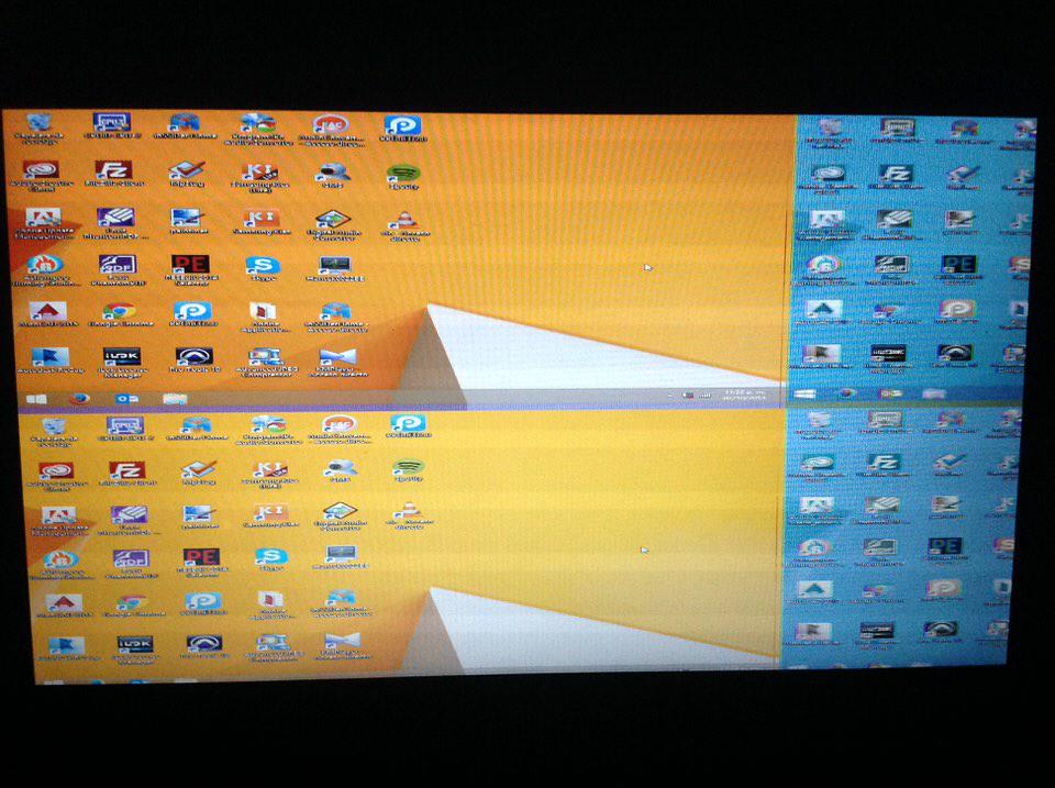 My situation is really strange. I installed Windows 8.1 and Mavericks in one hard disk drive with three partitions, one for each operating system and one just for storage purpose. Since my wireless network card (BCM943142HM) is not usable in OS X, I bought a USB Wifi Adapter (TP-LINK TL-WN725N) so that I could access internet. But when I use a lot of internet bandwidth (downloading torrents) the computer freezes completely. So I decided to work heavy internet use in Windows and just specific tasks on OS X. I’ve been using my computer in this way for almost 8 months without any additional issues. But recently I found somewhere that in order to stop the random freezes caused by the high internet’s bandwidth use, I had to disable Spotlight. So I did it, but the freezes continued. However I noticed that I could use the computer for a longer period of time before it froze again. So here is the problem. Yesterday, after some of this freezes I restarted the computer and now it beeps 8 times while booting indicating a display problem according to Dell, and the display shows up like this while booting and in Windows: But inside OS X the screen turns off. When I perform the display test according to Dell (holding down the D key and then pressing the Power button to turn on the computer) it shows solid colours indicating that the display panel is working correctly. Right now I’m using an external monitor connected to the HDMI port which is working correctly in both operating systems. Inside OS X it’s like there is no display panel connected to the graphics adapter, and in Windows it detects the display panel as a generic monitor. I’m really concerned about this. I know this is not a common problem, so I would appreciate any help!