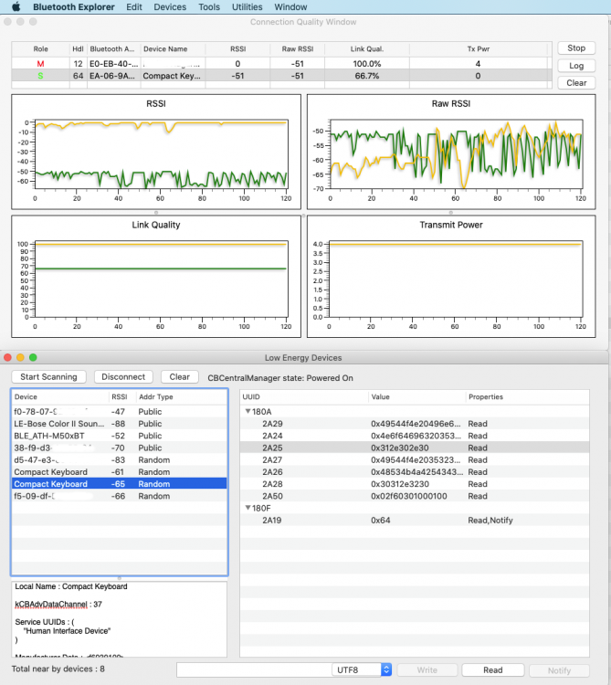 Hello guys, I've ran into unpleasant issue: I've bought Satechi Bluetooth Backlit Keyboard and paired it wit my hackintosh, no issue so far. After that I connected my bluetooth headphones - so far so good. Later I paired Apple Magic mouse 2 - everything works! BUT I started having sound issues so I've tried to delete all paired devices, and I've tried to re-pair them again. From this moment I'm unable to connect/pair the bluetooth keyboard --> needless to say, I've reseted the keyboard to factory defaults + reseted the Bluetooth module (shift + option + click on bluetooth menu idnicator --> debug) + deleted bluetooth.plist from Library/Preferences. I've even tried to update bluetooth kext. The keyboard connected/paired as charm with real Mac.... but I can't get it to work again with hackintosh -> even if it is the first device I try to pair. Is there please anyone willing to help? EDIT: I was able to connect the device via Apple Developers Tools --> Bluetooth explorer --> tools --> low energy devices and connect. As you can see, the keyboard is advertised twice ....no idea why, maybe because the keyboard is able to connect to 3 devices (hardware switch). Keyboard has no more the keyboard icon, but generic BT icon - but it survived reboot :). I'll try to dig deeper into this issue and compare the statistic with keyboard connected to real Mac. For example Link quality seems shitty. I
