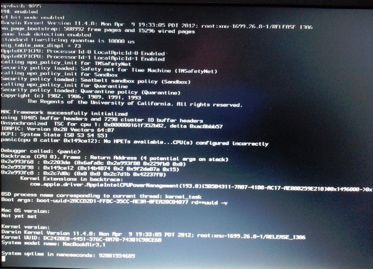 Hello OSXlatitude community- Newbie here. Got a cheap D430 from a craiglist - Found your site and decided to try it out as my first Mac (physical). After 2 weeks of frustration, not getting anywhere so hope someone else there can help! Issue- Cannot get to initial setup screen Steps I followed 1. Configured my bios per https://osxlatitude.com/index.php?/topic/2036-bios-settings-d430/ 2. downloaded myhack 3.3.1 3. downloaded bootback for 10.7 (confirmed my bios shows cpu is intel core duo) http://www.osxlatitude.com/packs/Dell/Dell_Latitude_D4x0-lion.zip 4. Created boot usb using the above along with OSX 10.7.5 image (also tried 10.7.4, 10.7.2 and 10.7) 5. Replaced /extra folder with the contents from bootpack 6. Installed OSX using usb stick, selected to install extra from "my own" and selected the extra folder on USB stick 7. rebooted, but got kernel panic screen 8. tried replacing extra folder with one I found in this thread and re-ran myhack / reapplied extra https://osxlatitude.com/index.php?/topic/2843-d430-kernel-panic-because-kexts-fail-to-load/?hl=%2Bd430+%2Bkernel+%2Bpanic 9. reboot, getting this screen. (just stays there forever) 10. It does boot to setup screen if I use safe option (-x), but then network/mouse/kb is not found. Any help would be appreciated.