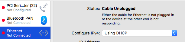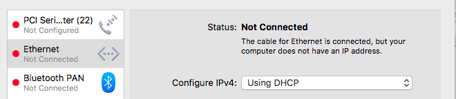 Hey team. This is easily the nicest "Mac" I've ever owned. Thanks again a million times for maintaining this site, and for helping me and everyone else so often and so well. My latest hiccup is wired Ethernet; when I plug in the cable, under Network Preferences it flips back and forth between "unplugged" and "no IP address": It's a known working cable, and I have both a link light and an activity light on the back of the laptop. What other info would be helpful to troubleshoot this? Thanks in advance!