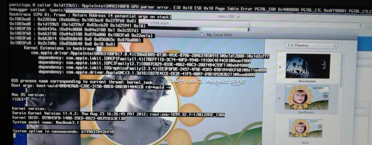 Hi, my D630 have been running very well for sometime, but in the last days i get randomly kernel panics. "panic(cpu 0 caller 0x1d159b5): AppleIntelGMAX3100FB GPU parser error. ...." (full plot in attachment) please, can anyone help me to avoid such annoying break down. installed my system with edp v5.2 it's a Lion 10.7.5 full myfix doesnot fix my problem. would be glade to read any hints, thanks