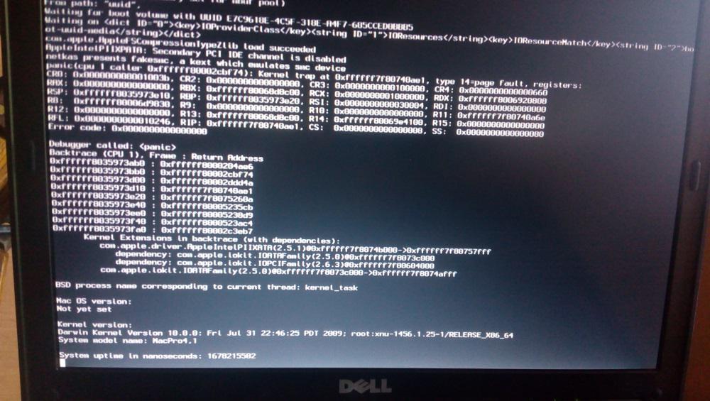 Hello, I am new here and am attempting to install Snow Leopard on a Dell Latitude D630. I have followed the instructions provided at the following link- http://www.osxlatitude.com/edp/documentation/installation/and have run into a kernal panic. It states: panic(cpu 0 caller 0xffffff800053e932): "Unable to find driver for this platform: \"ACPI\".\n"@/SourceCache/xnu/xnu-1456.1.25/io kit/Kernel/IOPlatformExpert.cpp:1389 Debugger called: <panic> Bactrace (CPU 0), Frame : Return Address 0xffffff801ce33ce0 : 0xffffff8000204ae6 0xffffff801ce33de0 : 0xffffff800053e932 0xffffff801ce33df0 : 0xffffff8000522e60 0xffffff801ce33e40 : 0xffffff800052356b 0xffffff801ce33ee0 : 0xffffff80005238d9 0xffffff801ce33f40 : 0xffffff8000523ac4 0xffffff801ce33fa0 : 0xffffff80002c3eb7 I would really appreciate the help, Thanks in advanced