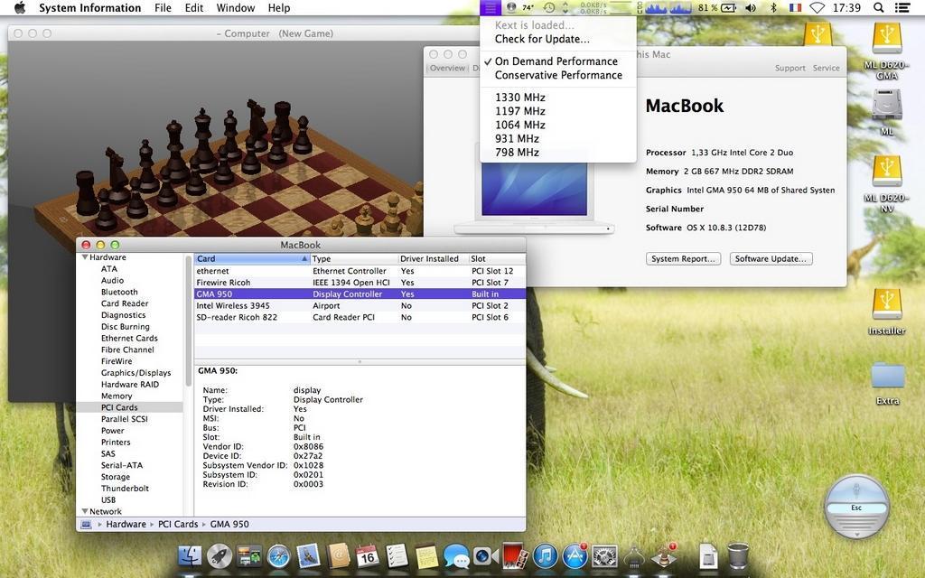 Last update: 03 Jan 2024 This guide applies to the Core2Duo D430 models. This guide was initially made with a MyHack-based installation of ML 10.8.0 + subsequent updates to ML 10.8.3/10.8.4/10.8.5. The bootpack was made out of the D630 nVidia ML bootpack where the DSDT table was replaced by the table from D430 Dual Core Lion bootpack, appropriate kexts removed and/or added and Chameleon plists replaced. EDIT - 20Aug 2014: ------------------------- Bootpack edited following report of missing Broadcom LAN kext. Pack is now fully loaded with all necessary kexts, modules and plists and no post-install EDP is really required for hardware fine tuning. Includes tuned Kozlek's FakeSMC + SMBIOS for native CPU SpeedStep. Extra D430 ML.zip This guide assumes you're using a blank HDD, partitioned and formated GUID. No tests done on MBR partitioned HDD, so don't ask about it, try it for yourself and report back if appropriate. Read the MacRumors guide thoroughly and follow it to the letter as far as creating the installer is concerned. Remember that it is not our hack and we do not support it. http://forums.macrumors.com/showthread.php?t=1325709 You need a legit copy of ML, i.e. the Install Mountain Lion.app application, otherwise forget it. The tool requires you to copy it to your Applications folder. It won't work if all you have is the InstallESD.dmg image. In June 2021, Apple finally made Mountain Lion freely available. A link to download the application package is available here. Phase 1: initial ML installation in mainstream 64bit kernel mode with unsupported graphics make the usual myHack USB installer for ML 10.8, using the attached LoRes or HiRes bootpack. myHack v3.3.1 is recommended. It's available here. boot the myHack USB installer and install ML 10.8, pointing to the /Extra folder of the installer media when prompted for the bootpack (do not choose generic). reboot into ML through your USB installer and complete 1st boot setup. you're now in ML 10.8 with default graphics at 1024x768 and without graphics acceleration. If you have not already done so, remove your myHack USB installer and put it aside. install recommended version of Chameleon (r2468) or Enoch (r2839) bootloader on your disk. They're available here. install latest update or combo update for ML 10.8.5 and all security updates for 10.8.5 (your wireless may not be supported at that stage, so use Ethernet port or install appropriate Wifi kext). reboot into latest version of ML 10.8.5, still with default graphics and without acceleration. Phase 2: MLPostFactor download MLPostFactor from here (original links posted in 2013 at MacRumors are dead since 2015). create a new small partition on your HDD (8 to 16GB) or insert and erase your myHack USB installer (or any other available external media). following MLPF instructions to the letter, run MLPostFactor and create an ML installer on the freshly created spare HDD partition or freshly erased USB key. Select the appropriate ML version that meets your installation and run the app, knowing that version 10.8.4 is to be selected for ML 10.8.5. upon completion, create a folder called Extra at the root of that installer media and copy DSDT table + SMBIOS & Chameleon boot plist files there. if you have a Bluetooth module, turn off your wireless services with the side switch (or laptop will look for a BT keyboard at next step and you'd need to hook up a USB keyboard). reboot off your initial ML disk/partition, interrupt the boot process at the Chameleon delay bar and select this newly created ML installer partition/disk with options & flag DSDT=/Extra/DSDT.aml arch=i386 -f. once installer is loaded, do not actually proceed with any installation (it would not be bootable). Go to Utilities in the menu bar and select MLPostFactor. when MLPostFactor app kicks in, click Continue until you're offered to select a destination volume. in the list available under the HDD icon, select your previously-made ML 10.8 installation, check the relevant 10.8.x case (select 10.8.4 for ML 10.8.5) and click Install MLPostFactor. upon completion, click Quit MLPostFactor, quit installation program and reboot ML 10.8 with flag and boot option -f arch=i386. If you switched off wireless services, turn the switch back on before the reboot. You will now have full QE/CI ! open up the Chameleon boot plist file in /Extra folder with TextEditor and add boot arg arch=i386 to ensure your system boots in 32bit kernel mode. If you have Chameleon Wizard app, use that to open up the boot plist and tick the 32-bit (i386) option, then save the file. open up Terminal and type sudo kextcache -system-prelinked-kernel -a i386 to rebuild the 32bit-mode cache; this will remove the need to boot with -f flag. For ML 10.8.5, edit file /System/Library/CoreServices/SystemVersion.plist to replace version number from 10.8.4 to 10.8.5. That's it, enjoy ML on your previously unsupported D620 GMA950. Remember that this hack is quite aggressive in the way it reverts to DP1 files and older graphics drivers (GMA950 kexts, OpenGL libraries), so you may find that things do not work. Again, don't ask for support here, go to the authors at MacRumors.