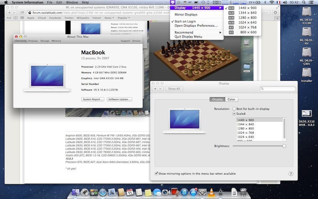 Last update: 03 Jan 2024 This guide applies to LoRes WXGA (1280x800) and HiRes WXGA+ (1440x900) models. This guide was initially made with a MyHack-based installation of ML 10.8.0 + subsequent updates to ML 10.8.3/10.8.4/10.8.5. The bootpacks were made out of the D630 nVidia ML bootpack where the DSDT table was just replaced by the table from D630 GMA X3100 Lion bootpacks (LoRes or HiRes). Extra_D630_LoRes_ML.zip Extra_D630_HiRes_ML.zip This guide assumes you're using a blank HDD, partitioned and formated GUID. No tests done on MBR partitioned HDD, so don't ask about it, try it for yourself and report back if appropriate. Read the MacRumors guide thoroughly and follow it to the letter as far as creating the installer is concerned. Remember that it is not our hack and we do not support it. http://forums.macrumors.com/showthread.php?t=1325709 You need a legit copy of ML, i.e. the Install Mountain Lion.app application, otherwise forget it. The tool requires you to copy it to your Applications folder. It won't work if all you have is the InstallESD.dmg image. In June 2021, Apple finally made Mountain Lion freely available. A link to download the application package is available here. Phase 1: initial ML installation in mainstream 64bit kernel mode with unsupported graphics make the usual myHack USB installer for ML 10.8, using the attached LoRes or HiRes bootpack. myHack v3.3.1 is recommended. It's available here. boot the myHack USB installer and install ML 10.8, pointing to the /Extra folder of the installer media when prompted for the bootpack (do not choose generic). reboot into ML through your USB installer and complete 1st boot setup. you're now in ML 10.8 with default graphics at 1024x768 and without graphics acceleration. If you have not already done so, remove your myHack USB installer and put it aside. install recommended version of Chameleon (r2468) or Enoch (r2839) bootloader on your disk. They're available here. install latest update or combo update for ML 10.8 (your wireless may not be supported at that stage, so use Ethernet port or install appropriate Wifi kext). reboot into latest version of ML, still with default graphics and without acceleration. Phase 2: MLPostFactor download MLPostFactor from here (original links posted in 2013 at MacRumors are dead since 2015). create a new small partition on your HDD (8 to 16GB) or insert and erase your myHack USB installer (or any other available external media). following MLPF instructions to the letter, run MLPostFactor and create an ML installer on the freshly created spare HDD partition or freshly erased USB key. Select the appropriate ML version that meets your installation and run the app, knowing that version 10.8.4 is to be selected for ML 10.8.5. upon completion, create a folder called Extra at the root of that installer media and copy DSDT table + SMBIOS & Chameleon boot plist files there. if you have a Bluetooth module, turn off your wireless services with the side switch (or laptop will look for a BT keyboard at next step and you'd need to hook up a USB keyboard). reboot off your initial ML disk/partition, interrupt the boot process at the Chameleon delay bar and select this newly created ML installer partition/disk with options & flag DSDT=/Extra/DSDT.aml arch=i386 -f. once installer is loaded, do not actually proceed with any installation (it would not be bootable). Go to Utilities in the menu bar and select MLPostFactor. when MLPostFactor app kicks in, click Continue until you're offered to select a destination volume. in the list available under the HDD icon, select your previously-made ML 10.8 installation, check the relevant 10.8.x case (select 10.8.4 for ML 10.8.5) and click Install MLPostFactor. upon completion, click Quit MLPostFactor, quit installation program and reboot ML 10.8 with flag and boot option -f arch=i386. If you switched off wireless services, turn the switch back on before the reboot. You will now have full QE/CI ! open up the Chameleon boot plist file in /Extra folder with TextEditor and add boot arg arch=i386 to ensure your system boots in 32bit kernel mode. If you have Chameleon Wizard app, use that to open up the boot plist and tick the 32-bit (i386) option, then save the file. open up Terminal and type sudo kextcache -system-prelinked-kernel -a i386 to rebuild the 32bit-mode cache; this will remove the need to boot with -f flag. For ML 10.8.5, edit file /System/Library/CoreServices/SystemVersion.plist to replace version number from 10.8.4 to 10.8.5. That's it, enjoy ML on your previously unsupported D630 X3100. Remember that this hack is quite aggressive in the way it reverts to DP1 files and older graphics drivers (GMA kexts, OpenGL libraries), so you may find that things do not work. Again, don't ask for support here, go to the authors at MacRumors. NB: Details of issues related to ML vanilla files that are re-instated by 10.8.5 security updates are kept in the D430 MLPF guide. They should no longer apply since ML went out of support and no further updates published.